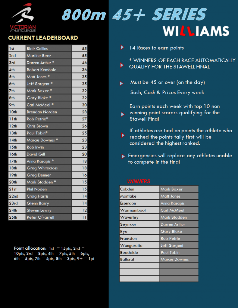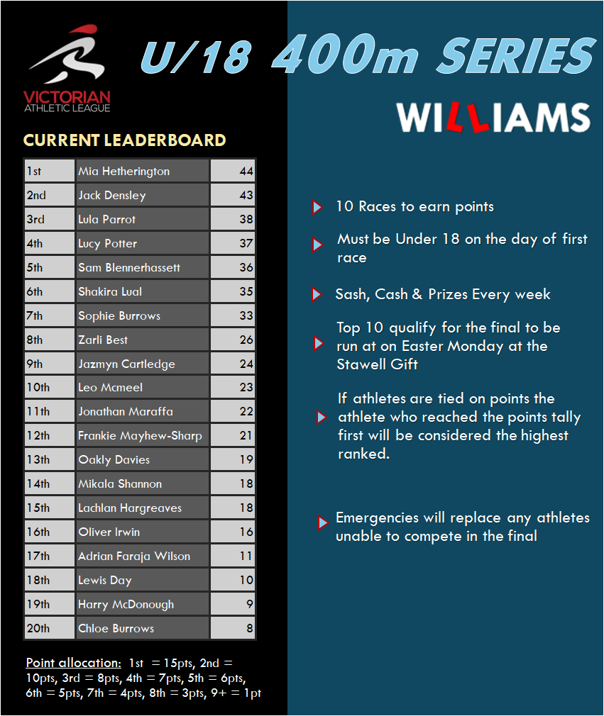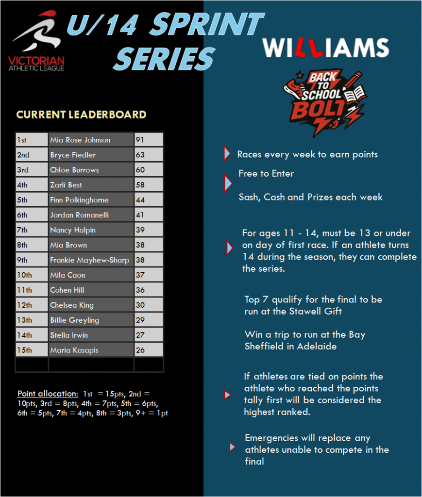 The Ballarat under 14 races were ran as 2 separate boys and girls races with 2 winners for boys and girls. In regards to the points allocation for the series final at Stawell, it has been decided that when determining points from Ballarat, all the athletes (both boys and girls combined) will be listed in order of times they ran in their finals. Points will then be allocated in this order.